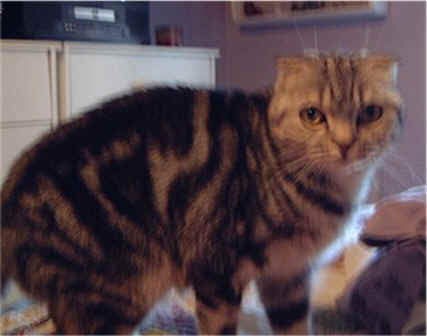 Scottish Folds are a 40-year old breed that happened accidentally in Scotland from British Shorthairs. The ears remain folded down all their life, we think it makes her look even cuter. Silka is called a "double fold" because her ears are double folded down tight to her head. She can also wiggle her ears. Scottish Folds are typically a very warm, happy, friendly, and loving breed with a great easy-going temperament. She has a really tiny meow.